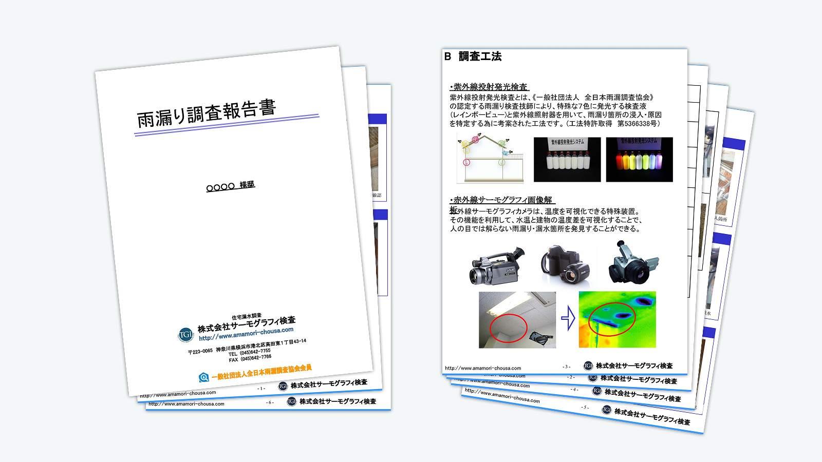 どこから水が入っているのか、どのような対策が必要なのかを明確にし、 補修工事にしっかりとつなげるための資料です。