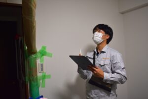 赤外線カメラで壁や天井の温度分布を確認し、通常とは異なる温度差から水分の存在を推測します。