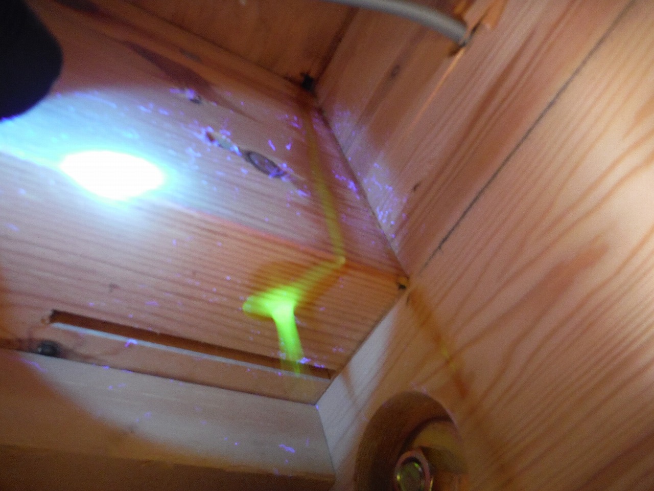 散水検査を経て、雨水の浸入の疑いのある絞り込んだ箇所へ紫外線発光検査液(緑色)を散水しました。