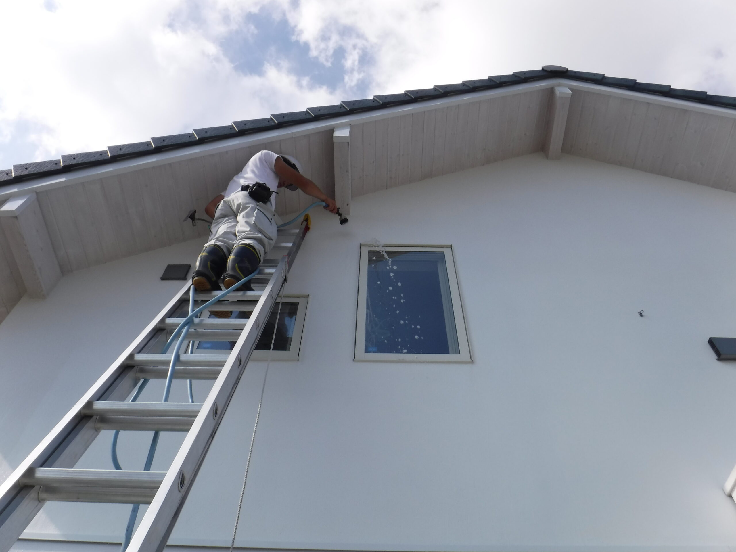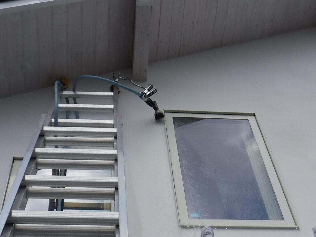 2連梯子を使用し、雨水の浸入が疑われる箇所に重点的に散水して調査しました。
