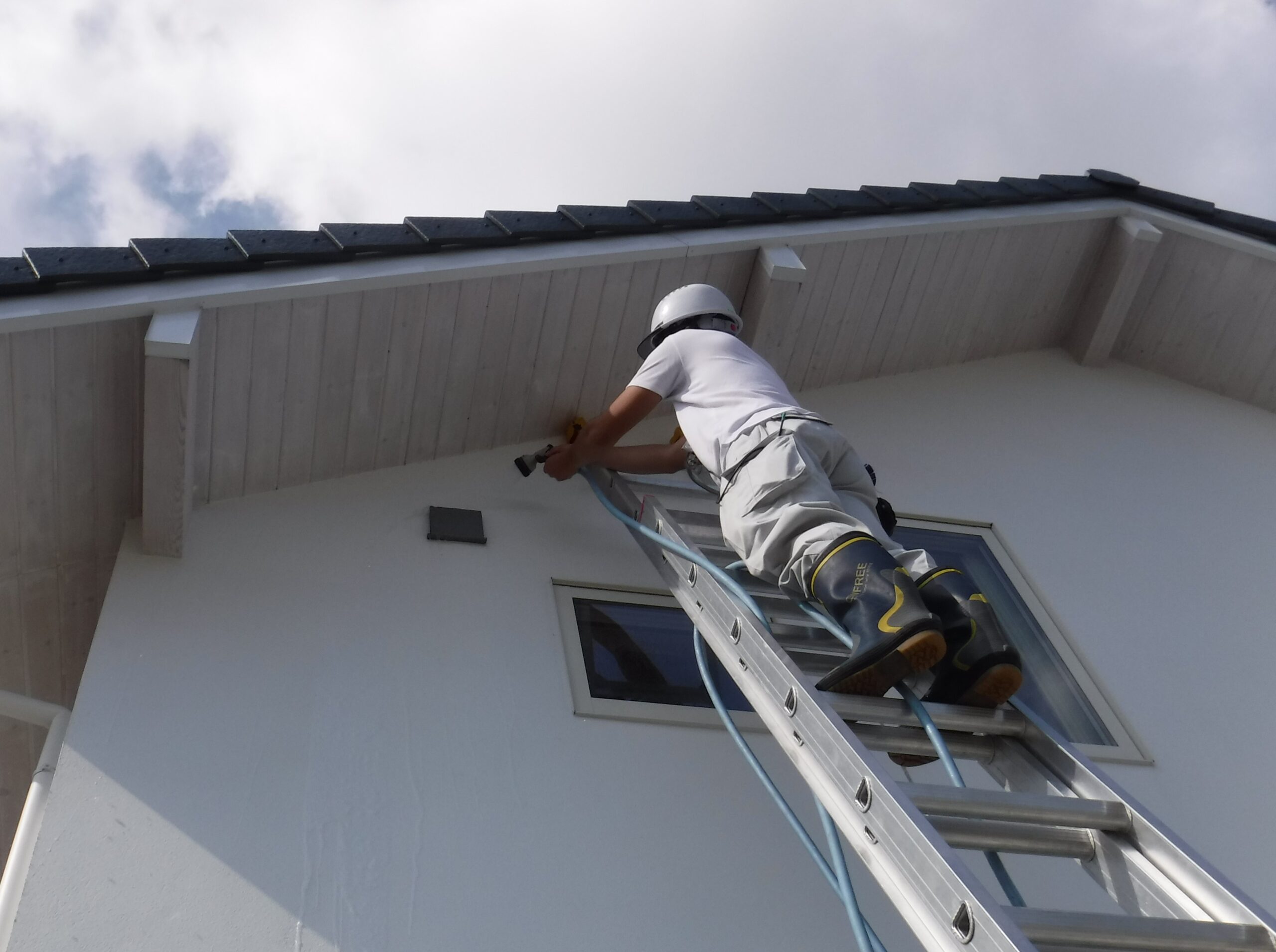 今回調査させていただいた建物は2階建ての2○階とのことで、2連梯子を使用しての作業でした。