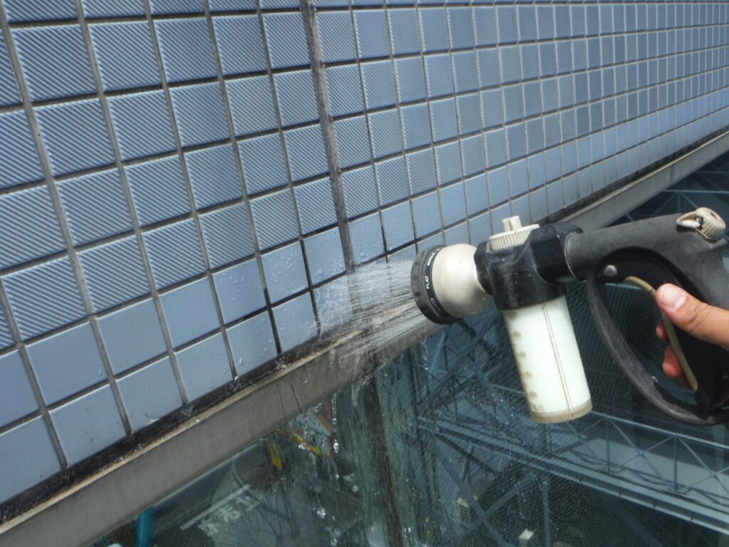 散水調査を経て、絞り込んだ1箇所の雨水の浸入の疑いのある箇所に緑色の検査液を散水しました。