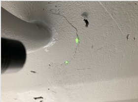 5階天井に、雨漏り再現を確認し、緑色の検査液反応を確認しました。