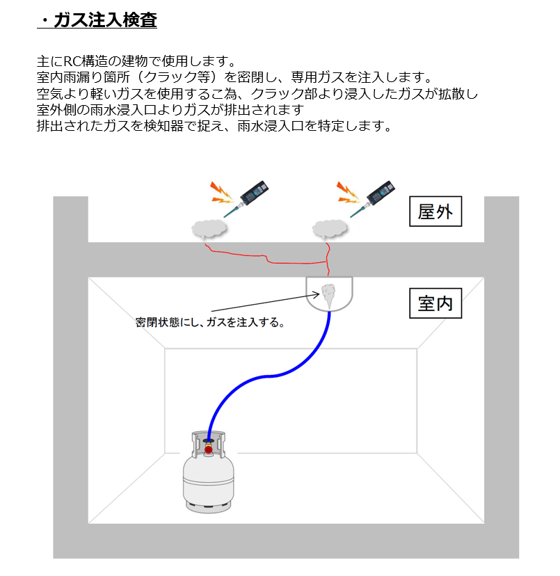 ガスは空気より軽いので、雨漏り浸入箇所に到達する、という原理を利用します。