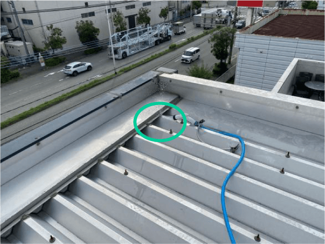 こちらに赤色の検査液を散水したら、雨漏り箇所から赤色の検査液が検出されました。