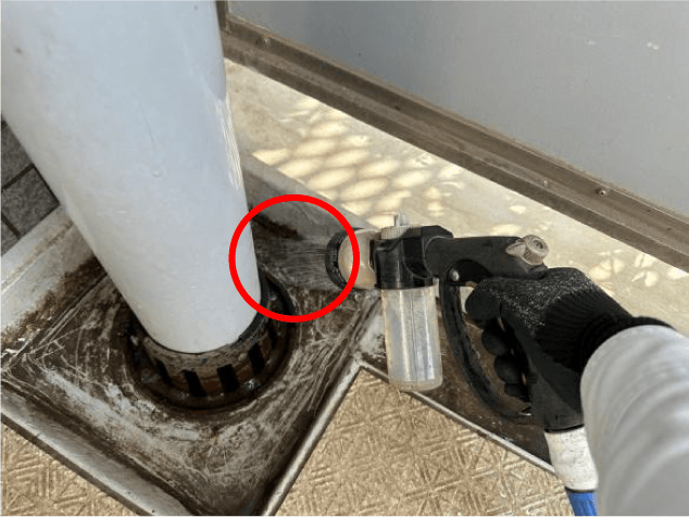 ベランダのドレンの防水の劣化している部分に検査液を散水しました。